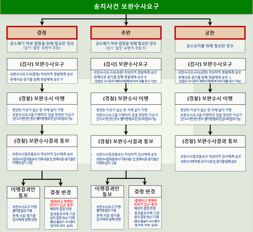 보완수사는 결정, 추완, 공판, 영장의 유형으로 구체화되어 있습니다.