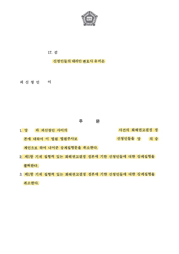 승계집행문을 받은 경우 재산에 대한 강제집행이 가능한 상황이므로 저희 카라 법률사무소는 서둘러 승계집행문 부여에 대한 이의 및 강제집행정지를 신청하였고, 상속포기 결정을 받자마자 위 사건에 상속포기 결정문을 제출하였습니다.
