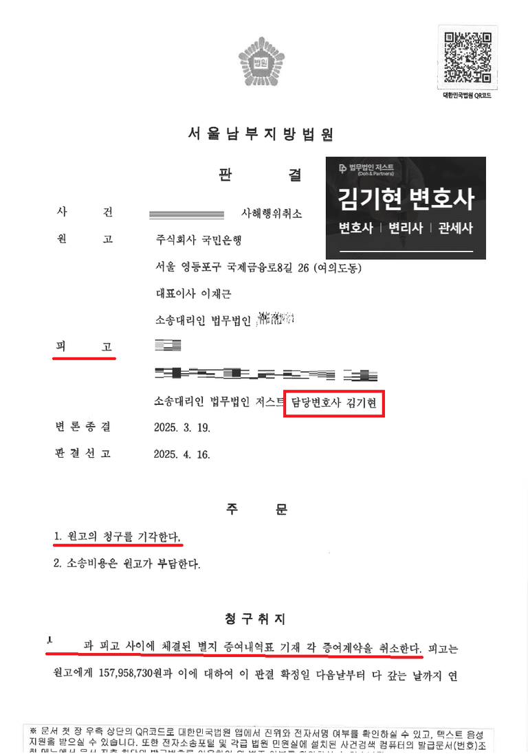 글자수 제한으로 인하여, 김기현 변호사가 피고 소송대리인을 맡아 승소했던 몇 건의 판결문만을 첨부합니다. 의뢰인들과의 비밀 유지를 위하여 사건 내용은 간략하게만 설명하겠습니다.
