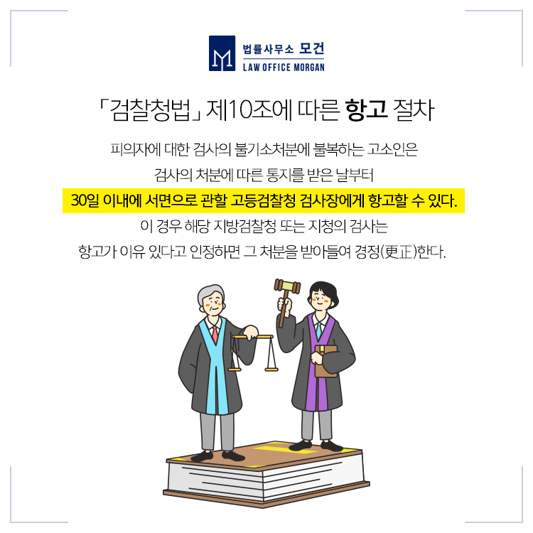 검사는 고소 또는 고발있는 사건에 관하여 공소를 제기하지 않는 처분을 한 경우, 그 처분을 한 날로부터 7일 이내에 서면으로 고소인 또는 고발인에게 그 취지를 통지하여야 하는데요. 이때 검사의 불기소처분에 불복하고자 하신다면 통지를 받은 날로부터 30일 내에 해당 처분을 내린 검찰청에 항고를 신청할 수 있습니다.