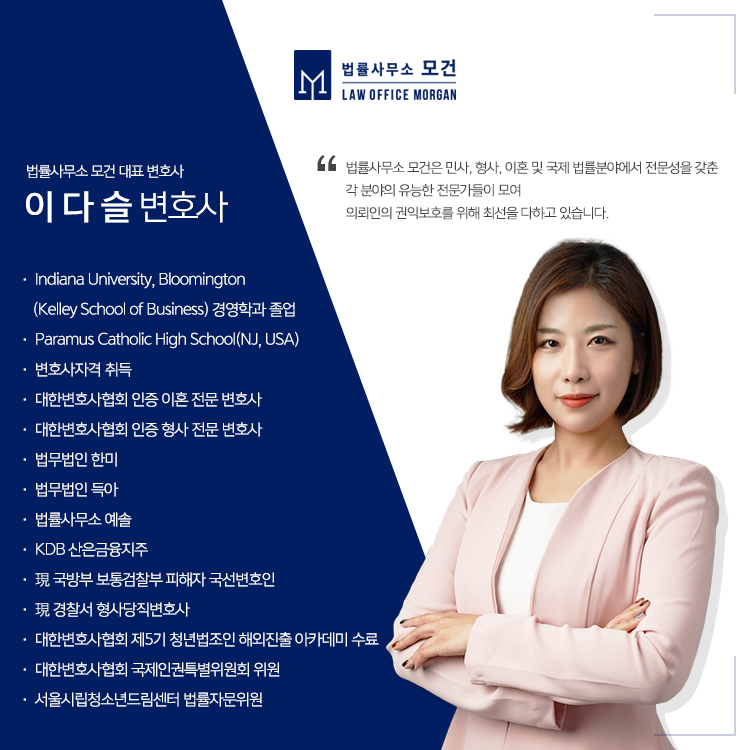 형사전문변호사인 법률사무소 모건의 이다슬 대표 변호사는 다수의 형사사건을 맡아 진행해 온 경험과 노하우를 살려 고소단계에서부터 철저한 도움을 드리고 있습니다. 만약 검사의 불기소처분으로 부당함을 느끼고 계시다면 이에 대한 항고절차와 재정신청까지 전반적인 도움을 받아보실 수 있으니 상담이 필요하신 분들은 법률사무소 모건으로 문의하셔서 대표 변호사의 자세한 도움을 받아보시기 바랍니다.