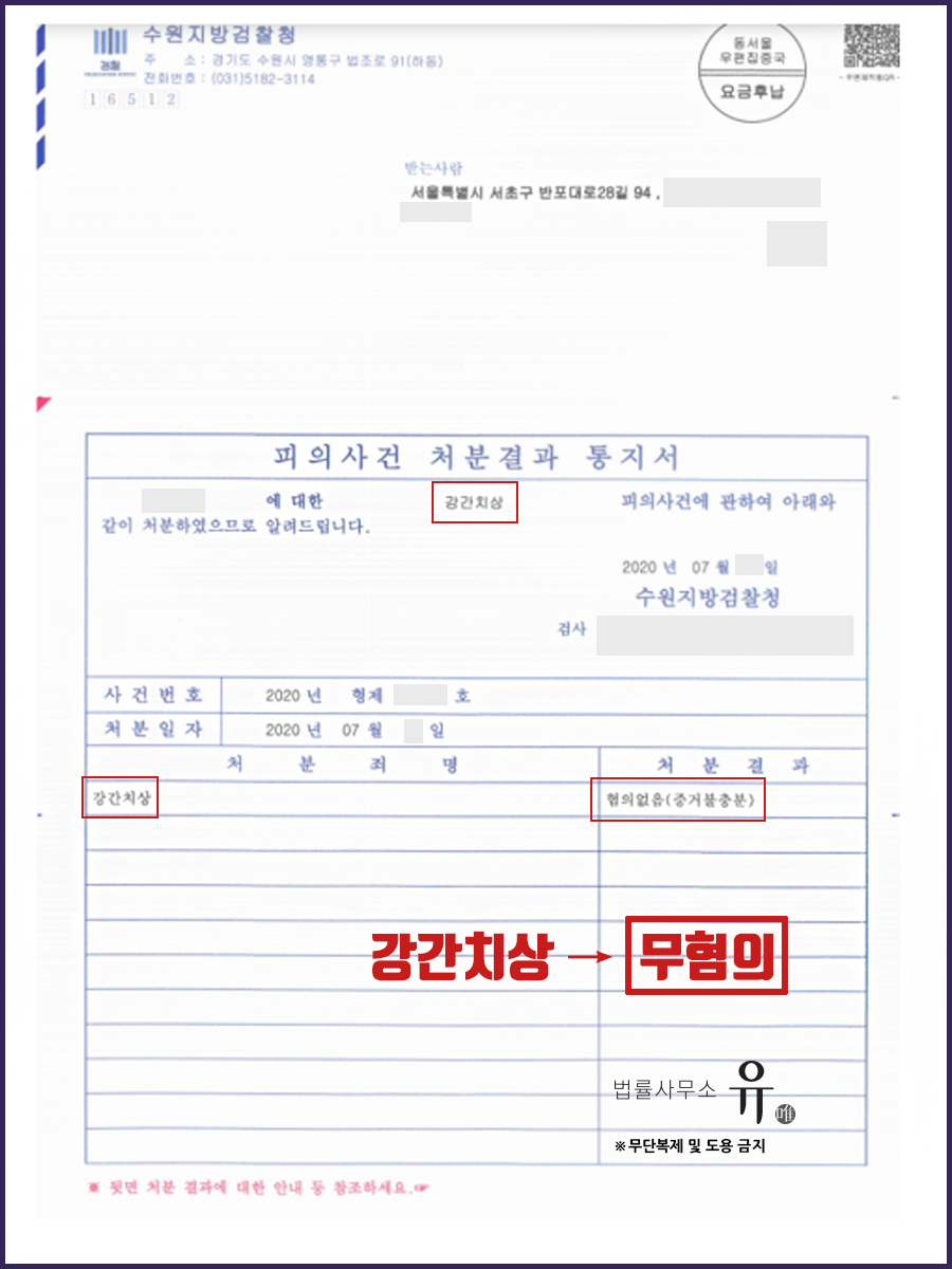 그결과, 수원지방검찰청에서는 의뢰인의 강간치상 혐의에 대해 무혐의 처분을 하였습니다.