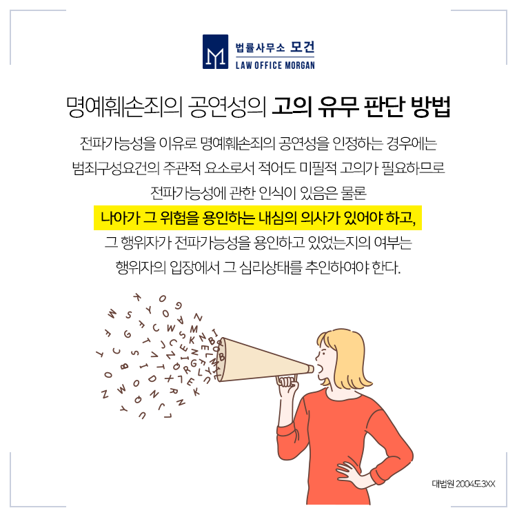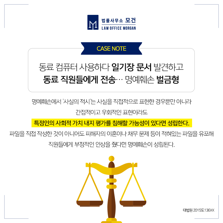 종로/광화문/마포 형사전문변호사인 법률사무소 모건의 이다슬 대표 변호사는 명예훼손죄에서 형사와 민사 모두에 성공사례를 보유하고 있으며, 고소대리 물론 피고소인의 혐의방어까지 전략적인 법률솔루션을 제공합니다. 직장에서 발생하는 명예훼손 분쟁으로 어려움을 겪고 계신 분들이라면 법률사무소 모건으로 문의하시면 대표 변호사의 자세한 법률자문을 받으실 수 있습니다.