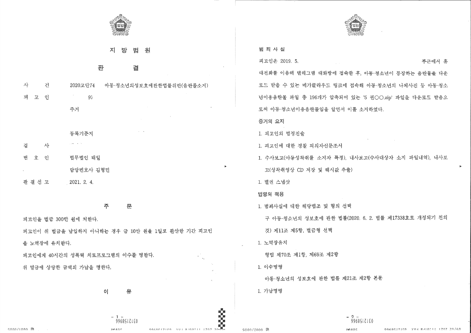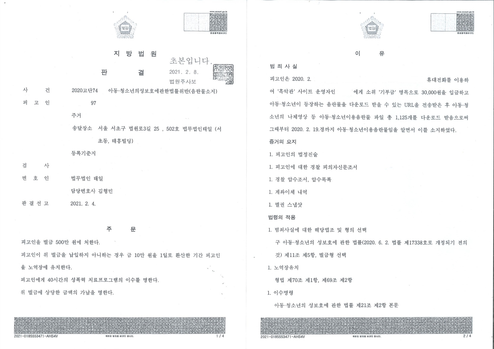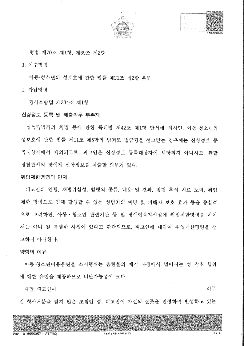 4. 흑악관 구매 아동청소년의성보호에관한법률(아청법) 아청물소지죄 벌금 500만원