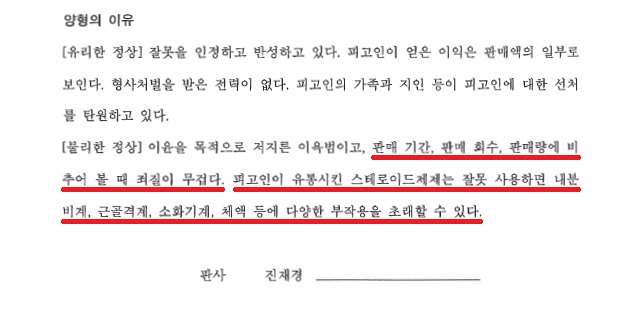 그런데 스테로이드 등의 불법 판매의 심각성에 대해 수사기관에서도 이를 인지하고 대대적인 수사를 진행하고 있고 법원도 이를 고려하여 강력히 처벌하고 있는데요. 스테로이드 등을 불법 판매한 경우에는 그 기간과 횟수, 수익 등에 따라 실형이 선고될 가능성이 매우 높으므로, 사건 초기부터 변호인의 조력을 받아 유리한 양형자료들을 풍부하게 제출하여 처벌 수위를 최대한 낮출 수 있도록 하는 것이 바람직하겠습니다.