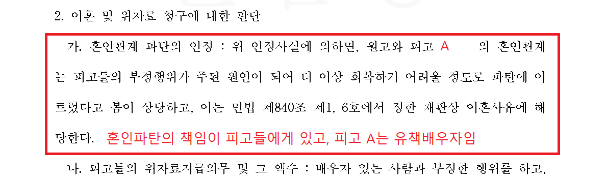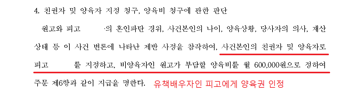 법원은 의뢰인(피고 A)의 부정행위를 인정해 위자료를 지급하라고 하면서도, 아이의 친권, 양육권은 유책배우자인 의뢰인에게 인정해 주었습니다.