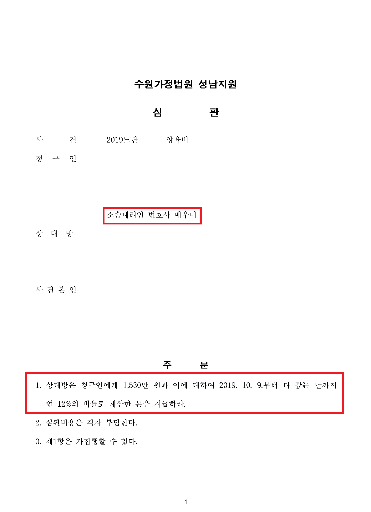 법원은 단 한 번의 변론기일만으로 사건을 종결하고 의뢰인의 청구금액 그대로의 과거양육비를 지급하라는 판결을 내렸습니다.