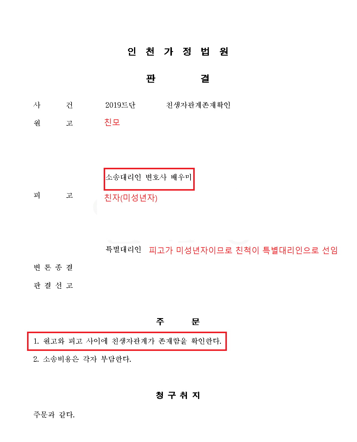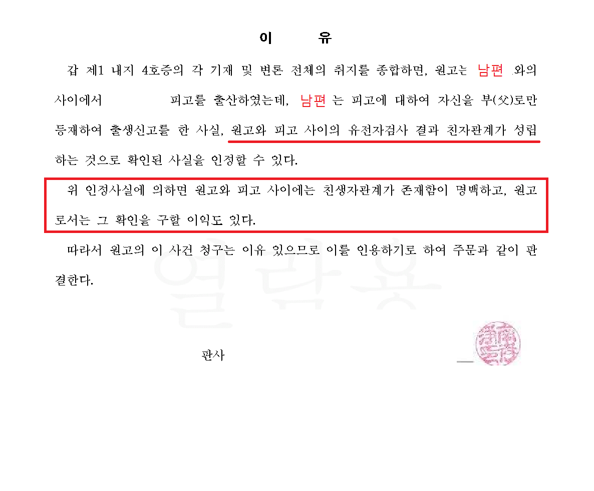 법원은 청구취지대로 의뢰인과 자녀의 친생자관계를 인정하는 판결을 내렸고, 의뢰인은 이를 토대로 가족관계등록부상 자녀와의 친모자관계를 인정받아 상속과 한부모 가정 지원금 등 모든 문제를 해결할 수 있었습니다.