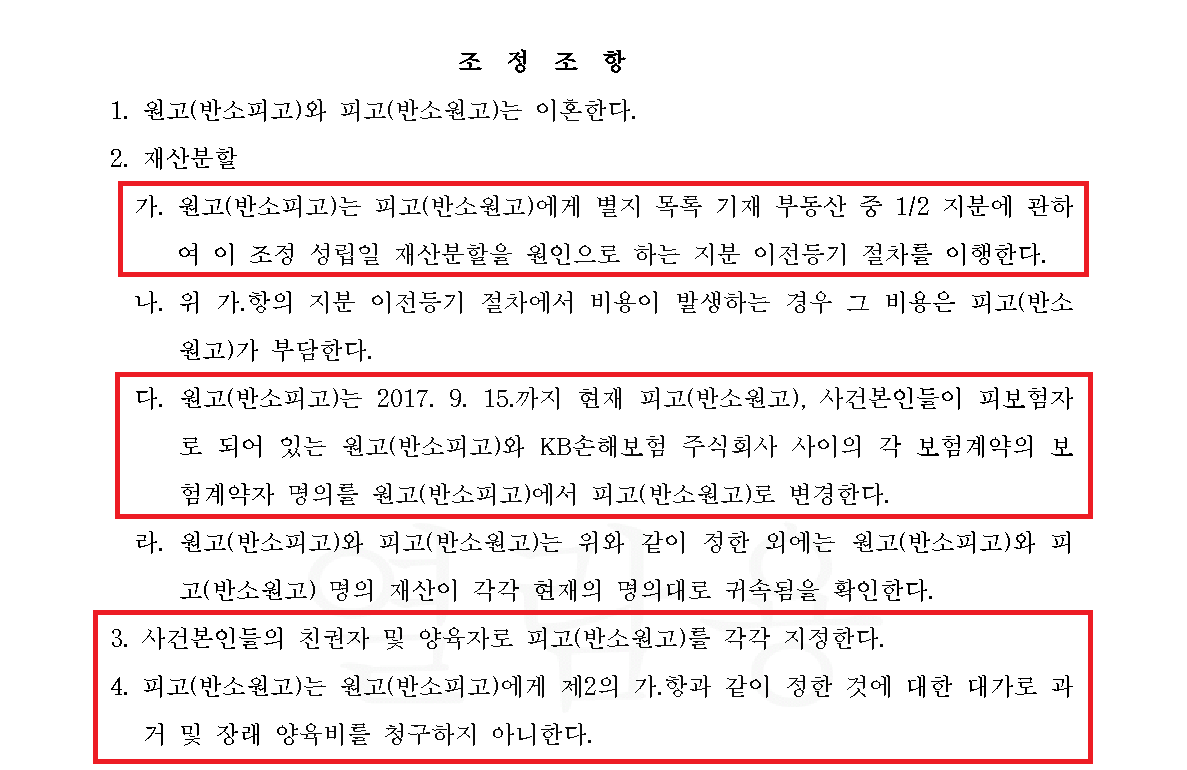 당사자와 각 대리인(변호사)이 참석한 조정기일에서 의뢰인이 상대방으로부터 돈을 한 푼도 주지 않고 아파트 지분 전체를 넘겨받되, 과거양육비와 장래양육비를 받지 않는 내용으로 원만히 조정이 성립되었습니다.