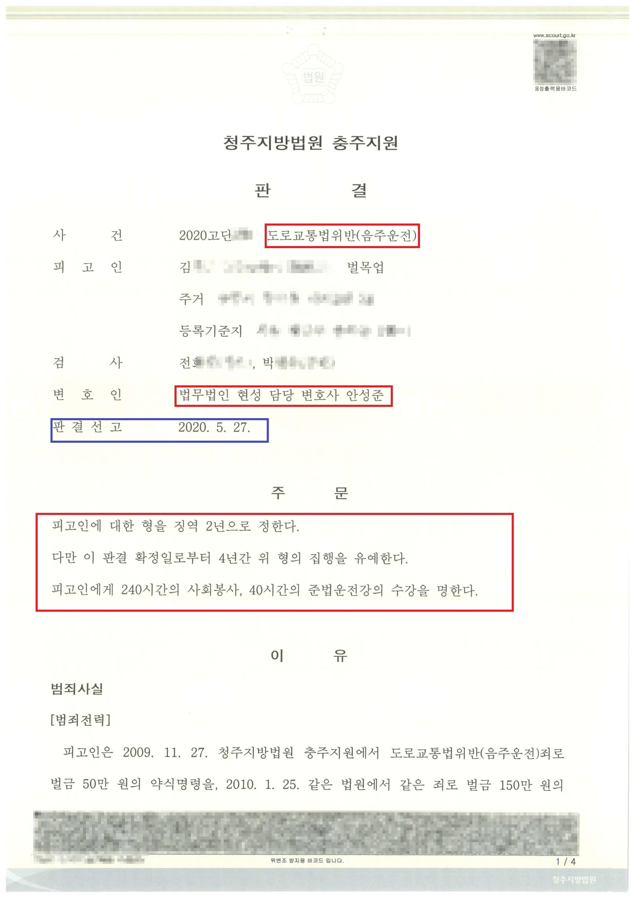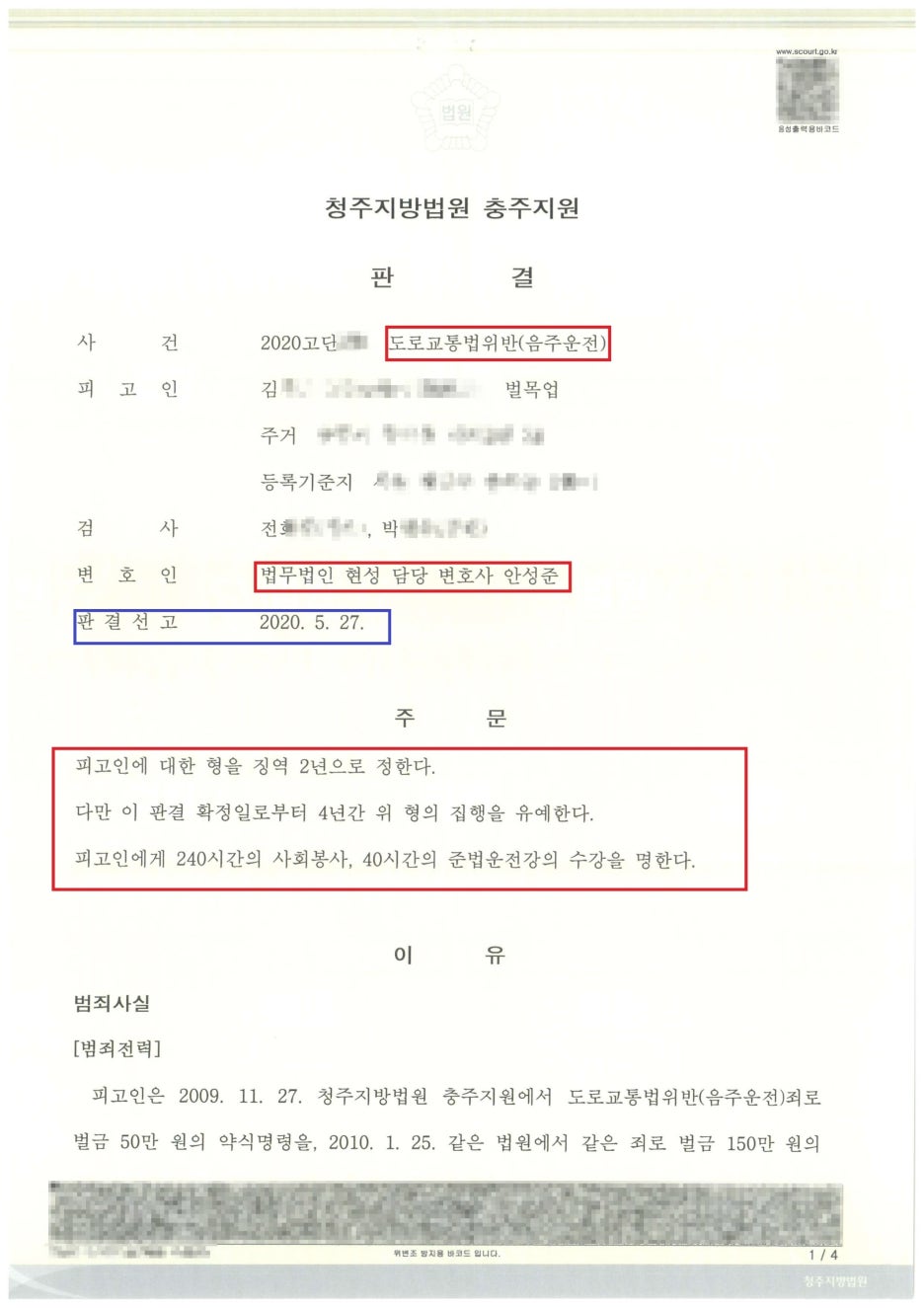 오늘 포스팅은, 종전 3차례 음주운전으로 처벌받고, 4번째 음주운전으로 적발된 피고인을변호하여 집행유예의 선처를 이끌어냈던 사안을 소개합니다. 소개에 앞서 관련 영상 링크를 첨부드리오니 참고하시기 바랍니다.