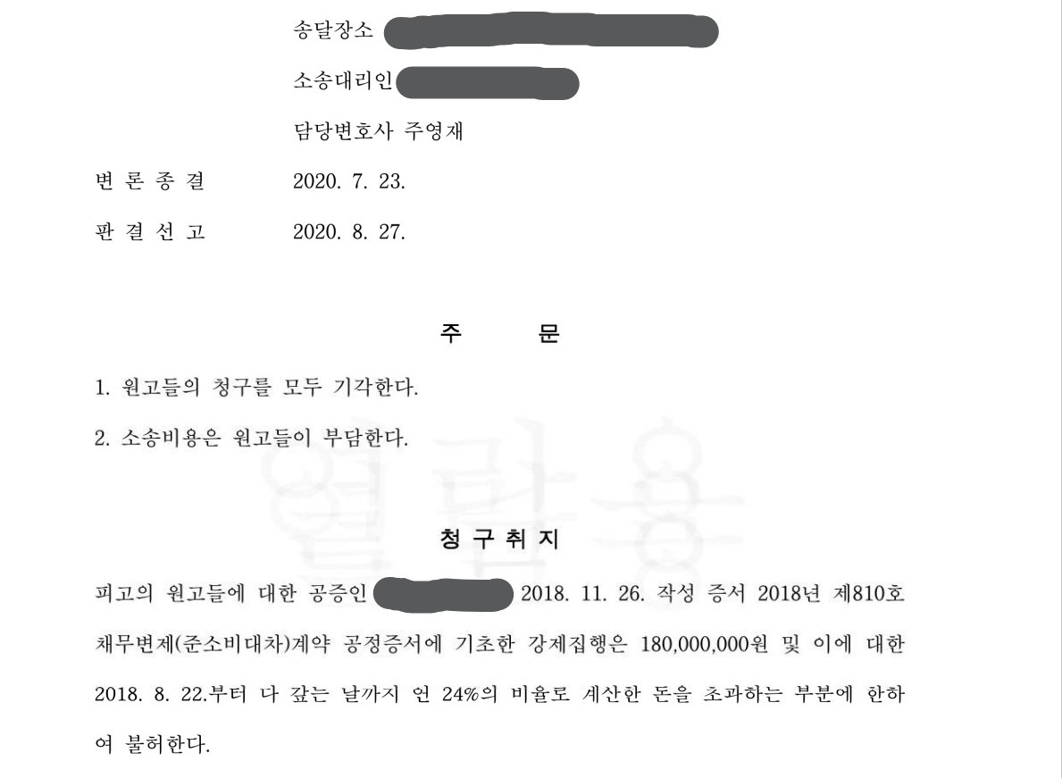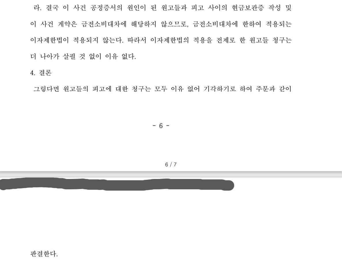 법원은 위와 같은 주영재 변호사의 주장을 받아들여 이 사건 계약은 금전소비대차계약이 아닌 동업 청산계약이므로 이자제한법이 적용될 수 없다면서 원고들의 청구를 전부 기각했습니다.