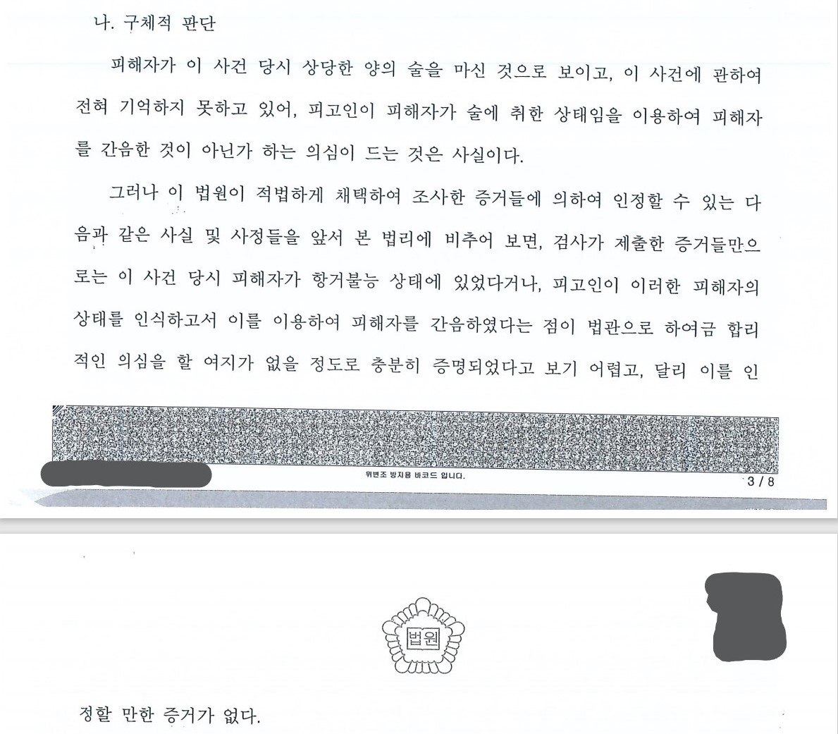 1심 재판부는 위와 같은 증거들을 통해 이 사건 범행 당시 피해자가 항거불능 상태에 있었다고 보기 어렵고, 설사 그랬다 하더라도 피고인에게 항거불능 상태를 이용한다는 고의가 있었다고 보기 어렵다면서 피고인에게 무죄를 선고했습니다.