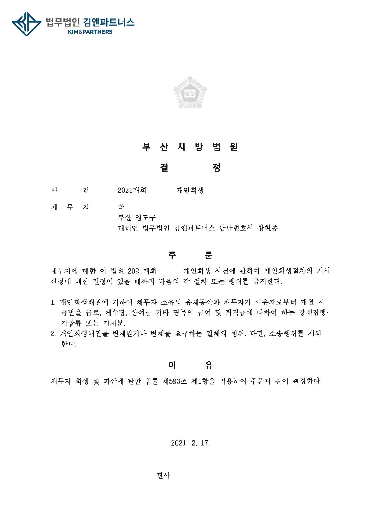 의뢰인은 금지명령을 받고 급여압류 등의 위험에서 벗어나 개인회생절차를 무사히 진행할 수 있을 것입니다.
