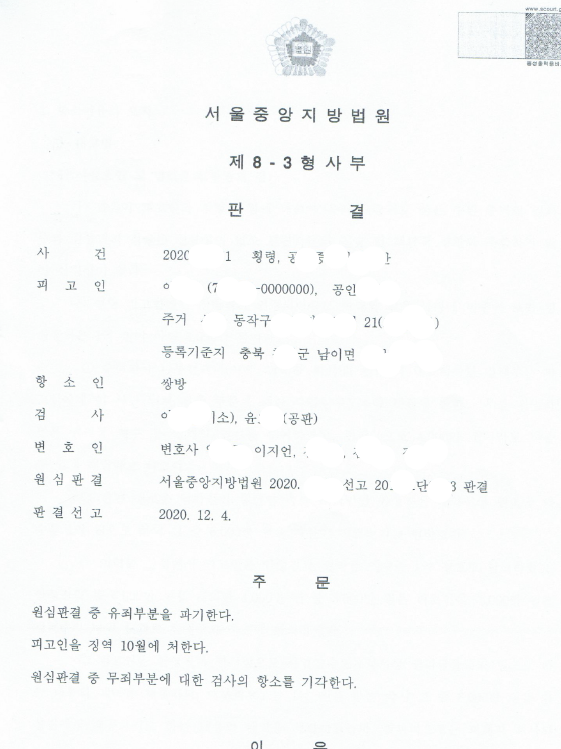 선고결과가 다소 아쉽기는 하지만 원심판결을 파기하는 것을 부담스러워 하는 재판부에서 최대한 저희의 무죄 주장이 이유있는 주장으로서 이를 고려해 준 결과였습니다.