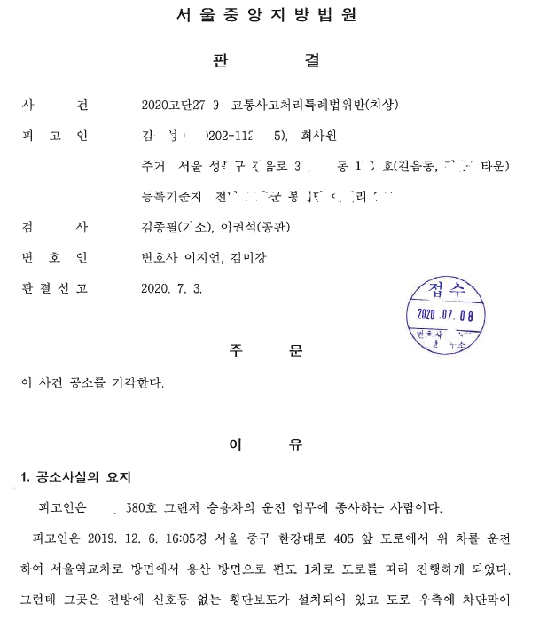 사건을 담당한 서울중앙지방법원 재판부는 저의 주장을 모두 받아들여 A씨에 대해서 '횡단보도에서의 보행자 보호의무 위반 사실이 인정되지 않기 때문에 A씨의 교통사고처리특례법상(치상) 사실에 대해서 무죄라고 설시하였습니다. (안전주의의무 위반의 점은 공소사실에 포함되지 않은 것으로 판단하였습니다.)