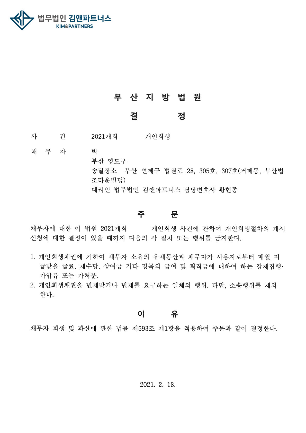 의뢰인은 금지명령을 받고 급여압류 등의 위험에서 벗어나 개인회생절차를 무사히 진행할 수 있을 것입니다.