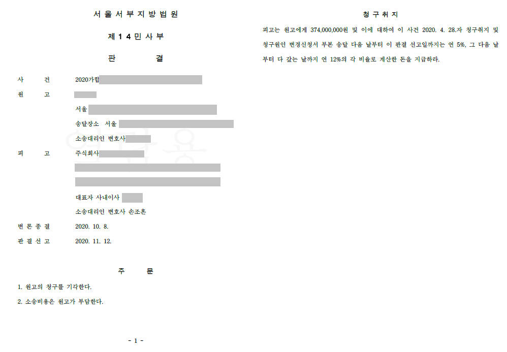 약 2년 가까이 진행된 재판 끝에, 법원은 손조흔 변호사의 주장을 받아들여, 상대방의 청구를 인정하면 배임이라는 불법적인 결과에 이르게 된다는 이유로, 상대방(원고)의 청구를 모두 기각하였습니다.