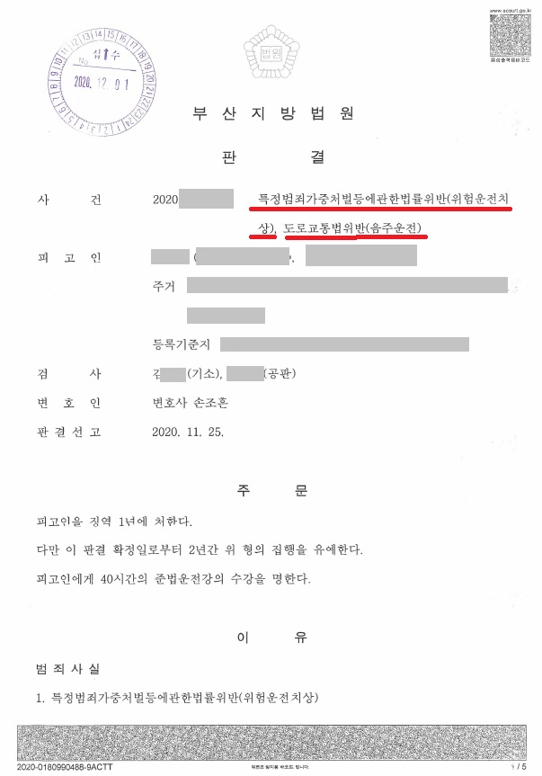 최근 윤창호법이 시행되는 등 음주사건에 대한 처벌이 강화되는 추세입니다. 그리고 몇몇 불리한 정상(알콜수치, 상해피해발생 등)이 있었으나, 법원은 손조흔 변호사의 정상변론을 받아들여 피고인에게 집행유예를 선고하였습니다.