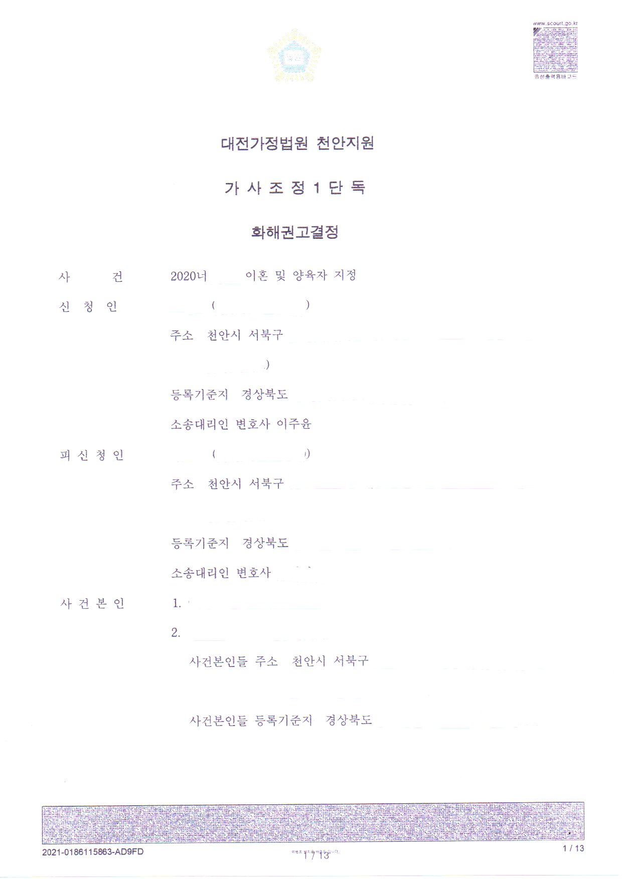 S씨는 사전에 법률사무소 위너스 이주윤 변호사와 함께 이혼조정사건을 시작하신 후 약 3개월 만에 법원에 단 한 번의 출석도 하지 않고 확정판결과 동일한 효력의 화해권고결정을 받았습니다.