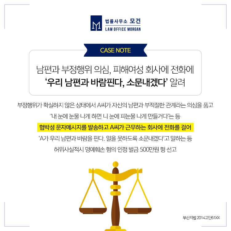 이에 그치지 않고 A씨는 C씨를 상대로 민사상 손해배상청구소송도 제기하였는데요. 재판부는 C씨가 A씨의 명예를 훼손하고 공포심이나 불안감을 유발하는 문자메시지를 보냄으로써 A씨의 평온한 일상생활을 누릴 수 없도록 방해하고, 이에 따른 A씨의 정신적 손해를 배상하라고 판결하였습니다. 다만, A씨와 남편의 부정행위에 기한 우발적, 충동적 행위인 점과 상간녀소송에서 이러한 불법행위가 일부 고려된 점이 인정돼 'C씨는 A씨에게 위자료로 100만원을 지급하라'고 판결한 사례입니다(인천지법 2016가단2055XX).