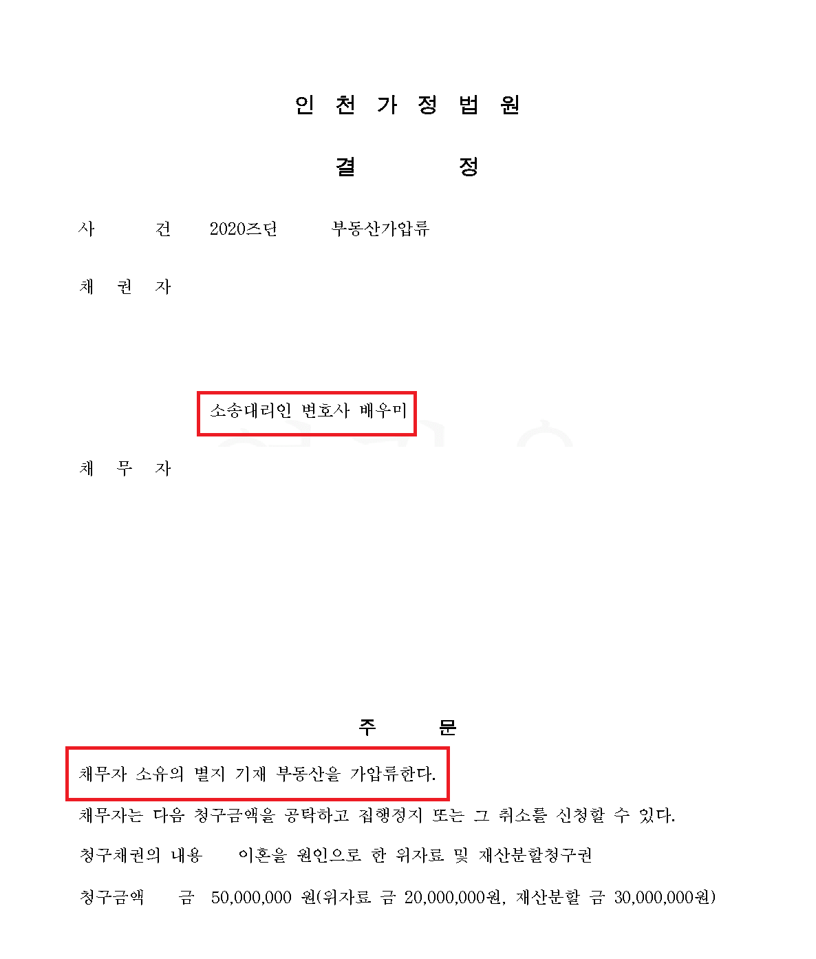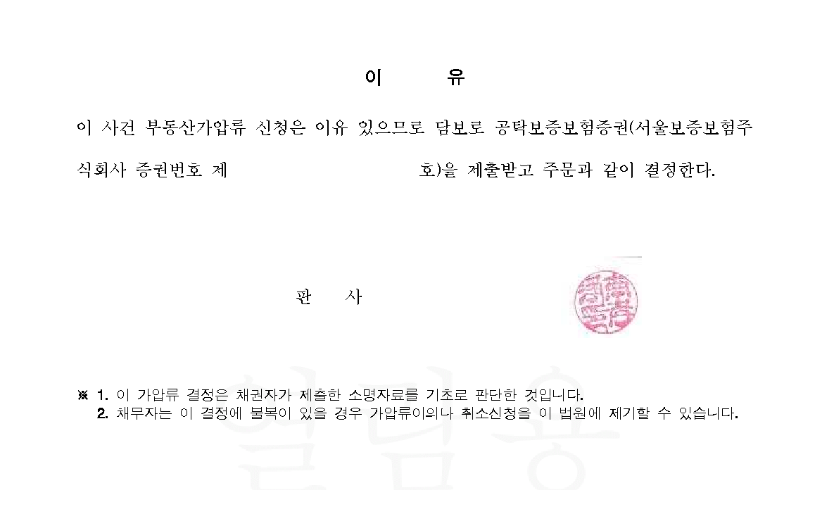 법원은 의뢰인과 상대방의 사실혼 관계를 인정하여 가압류 신청을 인용했고, 보증금은 현금이 아닌 보증보험증권으로 제출할 수 있도록 결정을 내려주셨습니다.