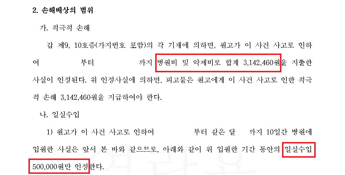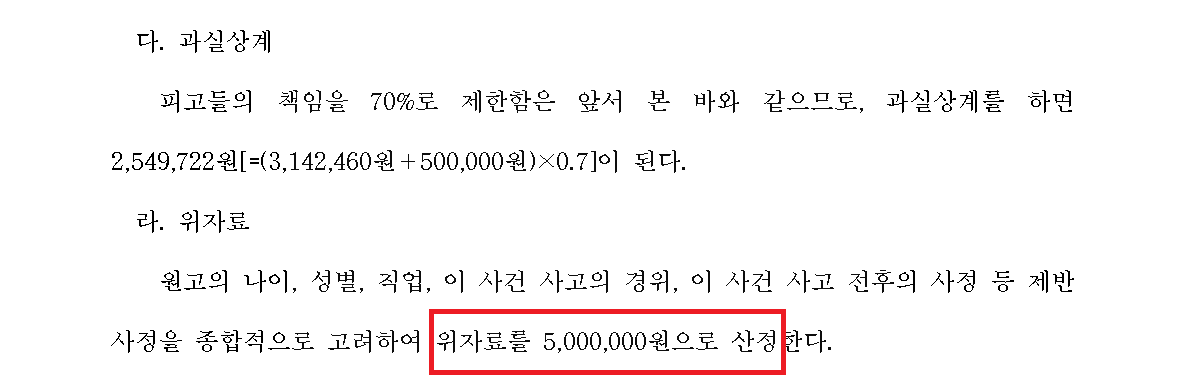 재판부는 자전거를 피하지 못한 의뢰인의 과실을 30%로 산정하면서도, 일반적인 자전거사고에서는 이례적인 500만원의 위자료를 인정했으며 의뢰인은 지출한 병원비와 일실손해 외에도 변호사비용까지 모두 보전받을 수 있었습니다.