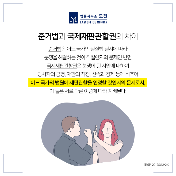 결국 대법원은 대한민국 법원에 재판관할권이 있다는 전제에서 A씨의 이혼청구를 받아들이고 재산분할을 명하되 위자료청구는 기각한 판결을 확정하였습니다(대법원 2017므12XXX).