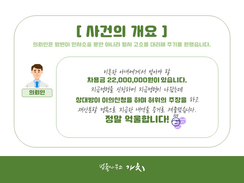 의뢰인은 이혼한 아내에게서 받아야 할 차용금 22,000,000원이 있어서 지급명령을 신청하여 지급명령이 나왔는데 상대방이 이의신청을 하며 허위의 주장을 하고 재산분할 명목으로 지급한 내역을 증거로 제출했다고 하며 억울해 하였습니다. 의뢰인은 방변이 민사소송 뿐만 아니라 형사 고소를 대리해 주기를 원하였습니다.