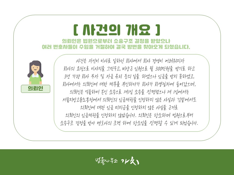 사건은 자신이 이사로 일하던 회사에서 회사 경영이 어려워지자 회사의 요청으로 이사직을 그만두고, 비상근 임원으로 월 300만원을 받기로 하고 3년 가냥 회사 투자 및 자금 유치 등의 일을 하였으나 임금을 받지 못하였고, 회사에서는 의뢰인에 대한 채무를 부인하였고, 그러다가 회사가 회생절차에 들어갔으며, 의뢰인은 억울하여 본인 소송으로 제1심 소송을 진행했으나 제 1심에서는 서울지방고용노동청에서 의뢰인의 임금채권을 인정하지 않은 사실과 검찰에서도 의뢰인에 대한 임금 미지급을 인정하지 않은 사실을 근거로 의뢰인의 임금채권을 인정하지 않았습니다. 의뢰인은 항소하며 법원으로부터 소송구조 결정을 받아 변호사의 조력 하에 항소심을 진행할 수 있게 되었습니다.