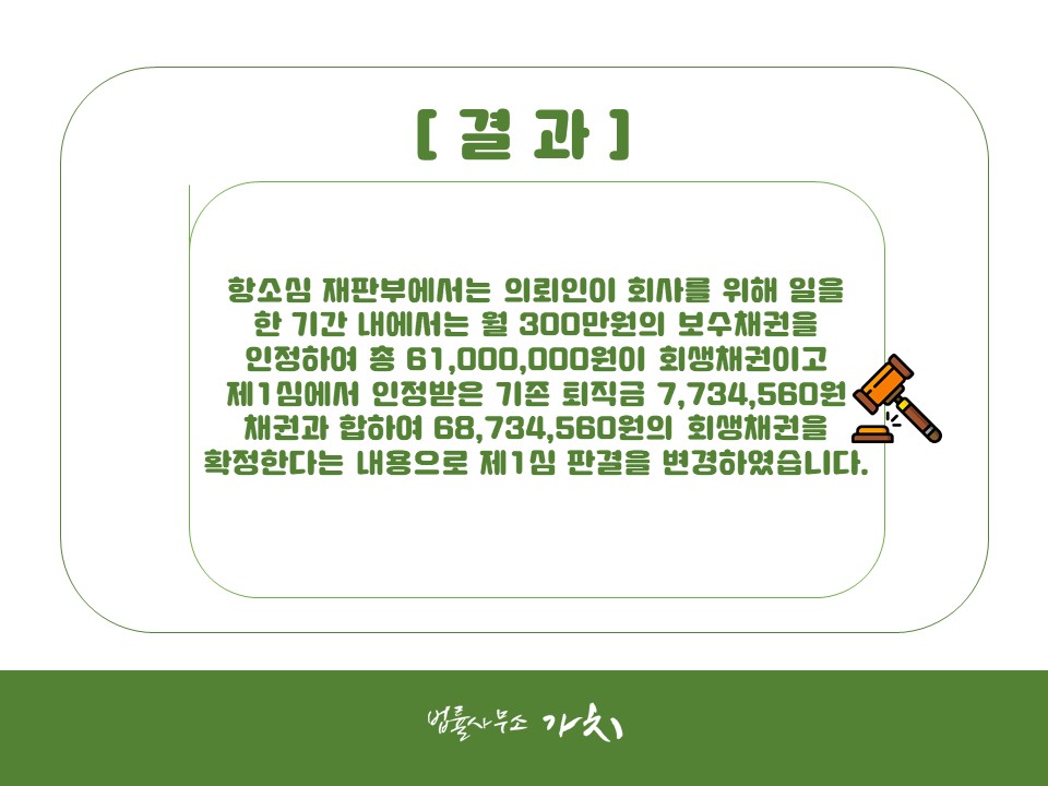 항소심 재판부에서는 의뢰인이 회사를 위해 일을 한 기간 내에서는 월 300만원의 보수채권을 인정하여 총 61,000,000원이 회생채권이고 제1심에서 인정받은 기존 퇴직금 7,734,560원 채권과 합하여 68,734,560원의 회생채권을 확정한다는 내용으로 제1심 판결을 변경하였습니다.