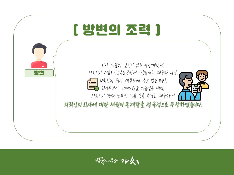 회사 대표의 날인이 없는 자문계약서, 의뢰인이 서울지방고용노동청에 진정서를 제출한 사실, 의뢰인과 회사 대표간에 주고 받은 메일, 회사로부터 300만원을 지급받은 내역, 의뢰인이 행한 업무의 내용 등을 증거로 제출하며 의뢰인이 회사에 대한 채권이 존재함을 적극적으로 주장하였습니다.