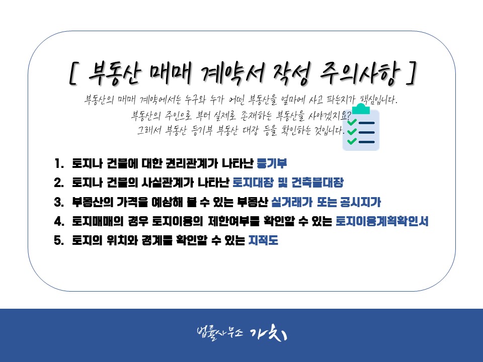 다섯 가지 자료를 확인하고 매매계약서를 작성하면 부동산의 주인으로부터 적정한 가격에 실제로 존재하는 부동산을 매수하는 계약서를 작성할 수 있습니다. 추가적으로 부동산 매수의 목적과 그 목적 달성을 위한 사항을 부동산 계약서 특약사항으로 적는 것도 분쟁을 예방할 수 있는 좋은 방법입니다.