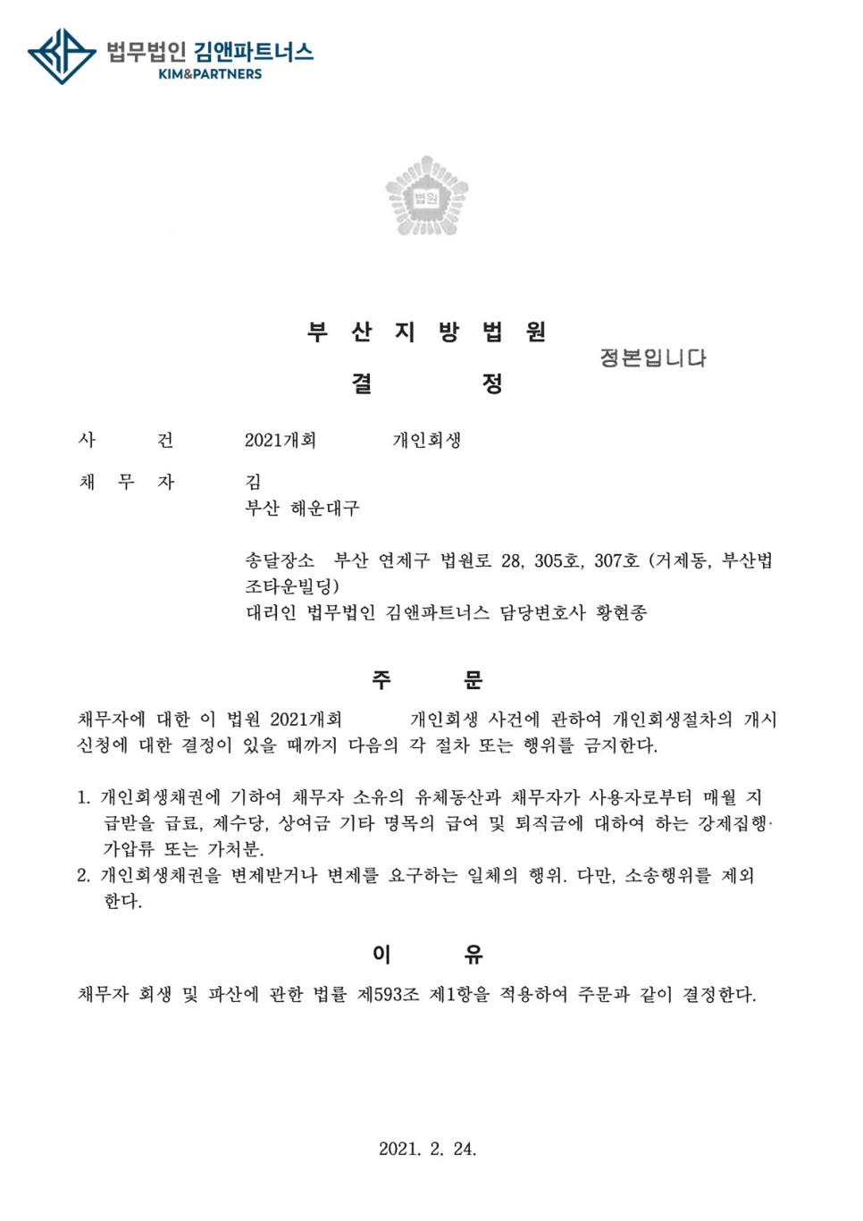 의뢰인은 금지명령을 받고 급여압류 등의 위험에서 벗어나 개인회생절차를 무사히 진행할 수 있을 것입니다.