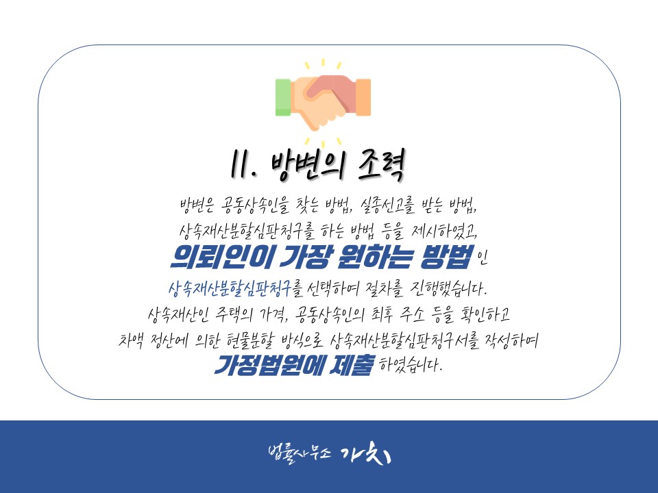 상속재산인 주택의 가격, 공동상속인의 최후 주소 등을 확인하고 차액 정산에 의한 현물분할 방식으로 상속재산분할심판청구서를 작성하여 가정법원에 제출하였습니다.