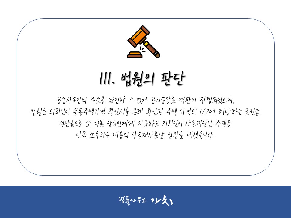 공동상속인의 주소를 확인할 수 없어 공시송달로 재판이 진행되었으며, 법원은 의뢰인이 공동주택가격 확인서를 통해 확인된 주택 가격의 1/2에 해당하는 금전을 정산금으로 또 다른 상속인에게 지급하고 의뢰인이 상속재산인 주택을 단독 소유하는 내용의 상속재산분할 심판을 내렸습니다.