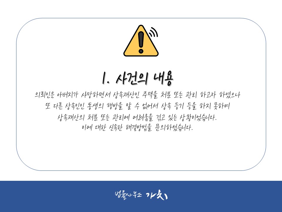의뢰인은 아버지가 사망하면서 상속재산인 주택을 처분 또는 관리 하고자 하였으나 또 다른 상속인인 동생의 행방을 알 수 없어서 상속 등기 등을 하지 못하여 상속재산의 처분 또는 관리에 어려움을 겪고 있는 상황이었습니다. 이에 대한 신속한 해결방법을 문의하셨습니다.