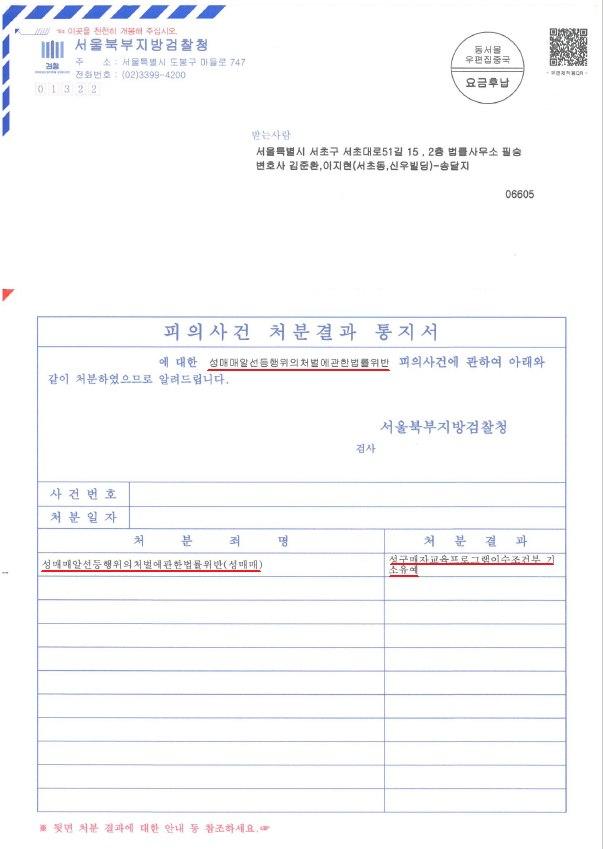 의뢰인님께서는 최근 성매매 처벌 수위에 비추어 벌금형이 선고될 위험이 높은 상황이었습니다. 그러나 앞서 말씀드린 다양한 방법으로 경찰, 검찰 수사 단계를 신중히 진행하였고 이에 서울북부지방검찰청은 의뢰인님에게 "교육조건부 기소유예"처분을 내렸습니다.