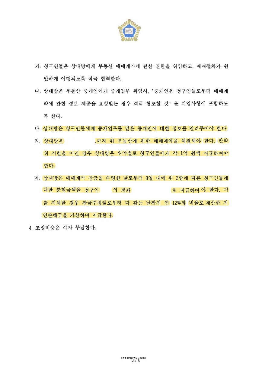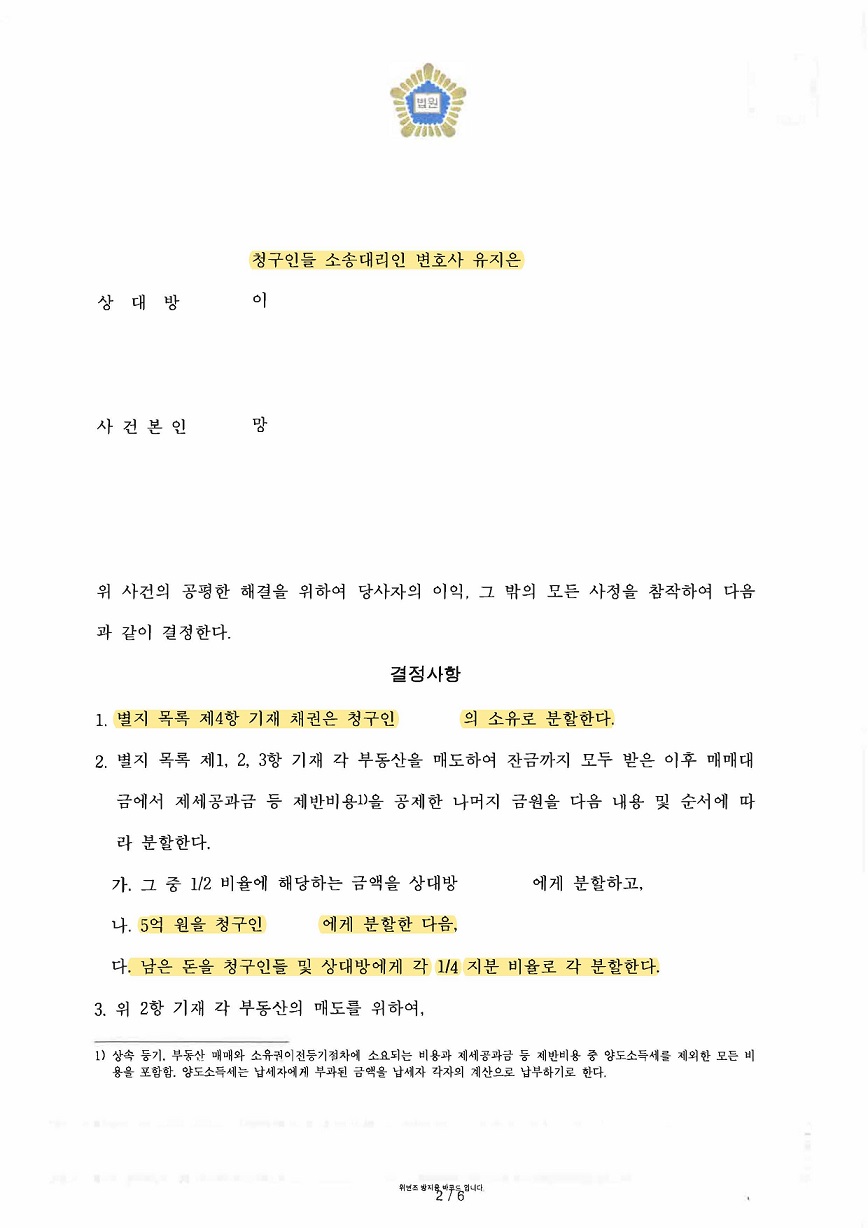 또한 피상속인의 예금채권은 기여도를 인정받은 의뢰인 소유로 분할받게 되었고, 상대방이 부동산 매도를 지체할 경우 위약벌로 의뢰인들에게 각 1억 원씩 지급하는 내용을 결정사항에 넣음으로써 의뢰인들 모두 만족스럽게 마무리가 된 사안입니다.