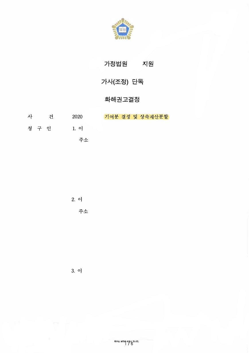 기여분을 인정받기가 쉽지는 않지만, 의뢰인의 기여분으로 약 50% 이상을 인정받았고, 결국 의뢰인들이 원하는 대로 상대방과 망인이 공유하고 있던 부동산 3채를 매도하여 그중 상대방이 원래 소유하고 있던 지분을 제외하고 기여분을 인정받은 의뢰인에게 5억 원을 우선적으로 지급하고, 남은 금원을 똑같이 1/4 지분씩 나눠 갖는 내용으로 성공적으로 조정이 성립되었습니다.
