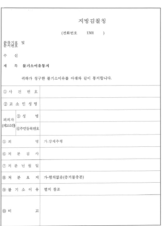 검사는 이 사건에 관하여 혐의없음 - 증거불충분의 불기소 처분을 하였습니다.