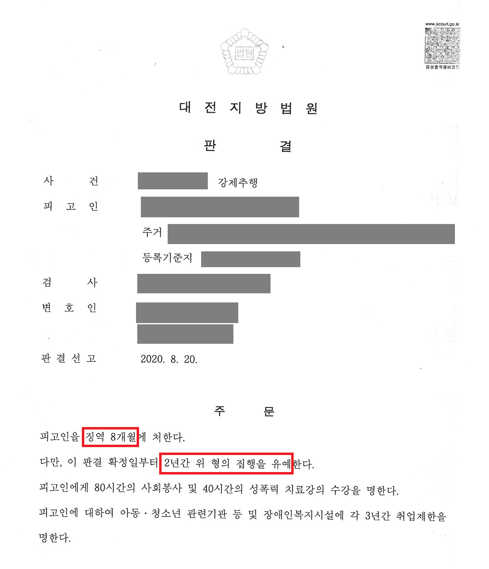 검찰은 피고소인을 강제추행죄로 기소하였고, 가해자는 뒤늦게 법원에서 자신의 잘못을 인정하고 반성하는 태도를 보였습니다. 법원은 가해자에게 징역 8개월, 집행유예 2년을 선고하였으며, 의뢰인은 결국 가해자로부터 정식으로 사과를 받고 피해보상금도 받을 수 있었습니다.