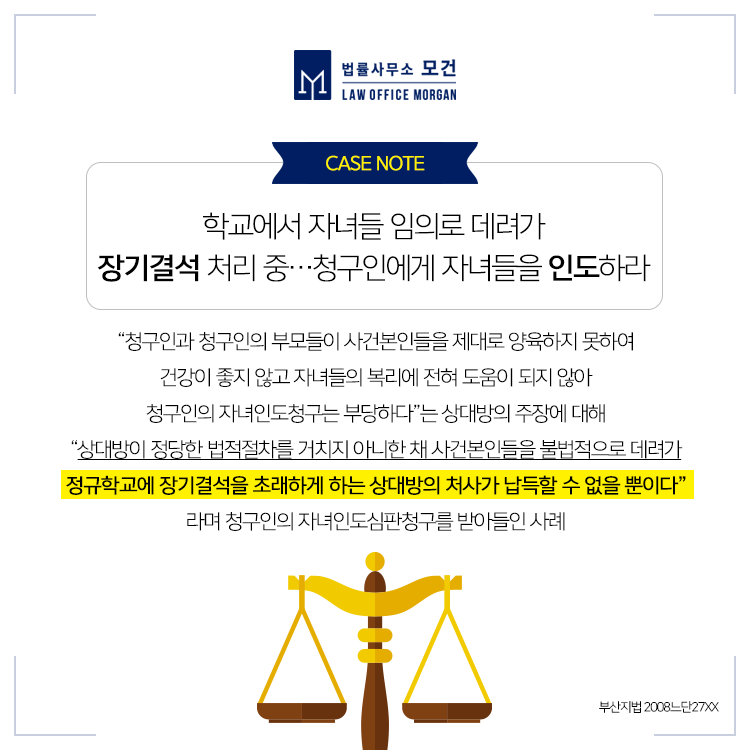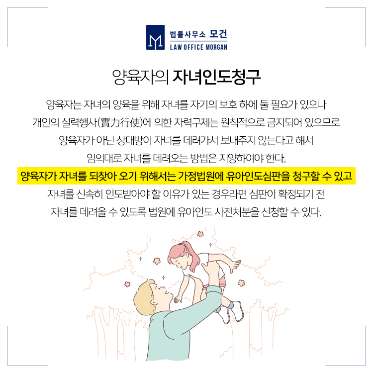 이에 가정법원에서는 '유아인도심판청구'를 허용하고 있는데요. 비양육친인 상대방이 자녀를 동의없이 데리고 가 자녀의 평화로운 환경을 깨뜨리고 자녀의 복리를 해치고 있음을 주장하여야 합니다. 만약 자녀를 신속히 인도받아야 할 이유가 있다면 사전처분을 신청할 수도 있습니다.