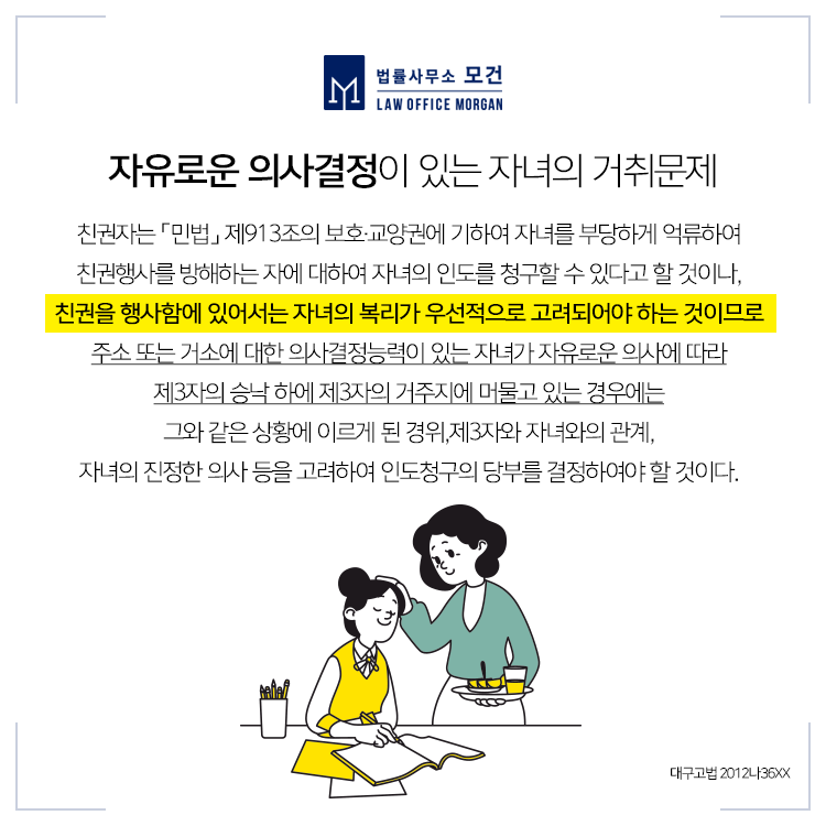 자녀가 스스로 자신의 거처를 선택할 수 있는 나이가 된다면 유아인도심판청구가 진행된다 하더라도 자녀의 의사가 큰 영향을 미칠 수 있습니다. 또한 유아인도심판청구 진행 시 상대방은 '양육자를 자신으로 변경해달라'는 청구 또한 함께 진행할 수 있으므로 관련 사건에 경험많은 이혼전문변호사와 함께 하는 것이 유리합니다.