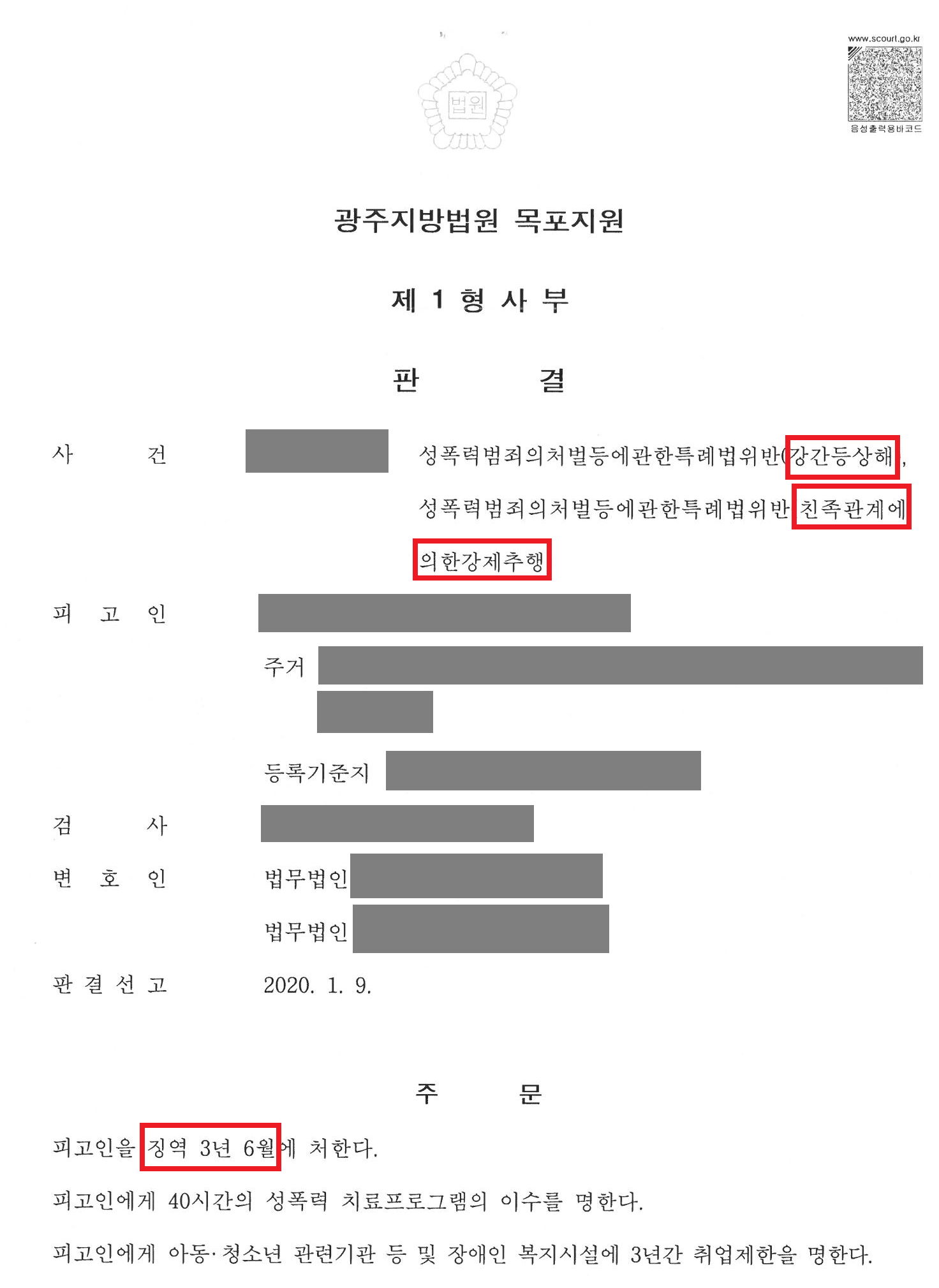 법원은 가해자에게 친족관계에 의한 강제추행 2회, 강간하려다 미수에 그치고 피해자에게 전치 2주의 상해를 입혔다는 혐의를 모두 인정하고 가해자에게 징역 3년 6월을 선고하였습니다. 가해자는 유죄 판결에 불복하여 항소하였으나 모두 기각되어 현재 3년 6개월의 수감생활을 보내고 있습니다.
