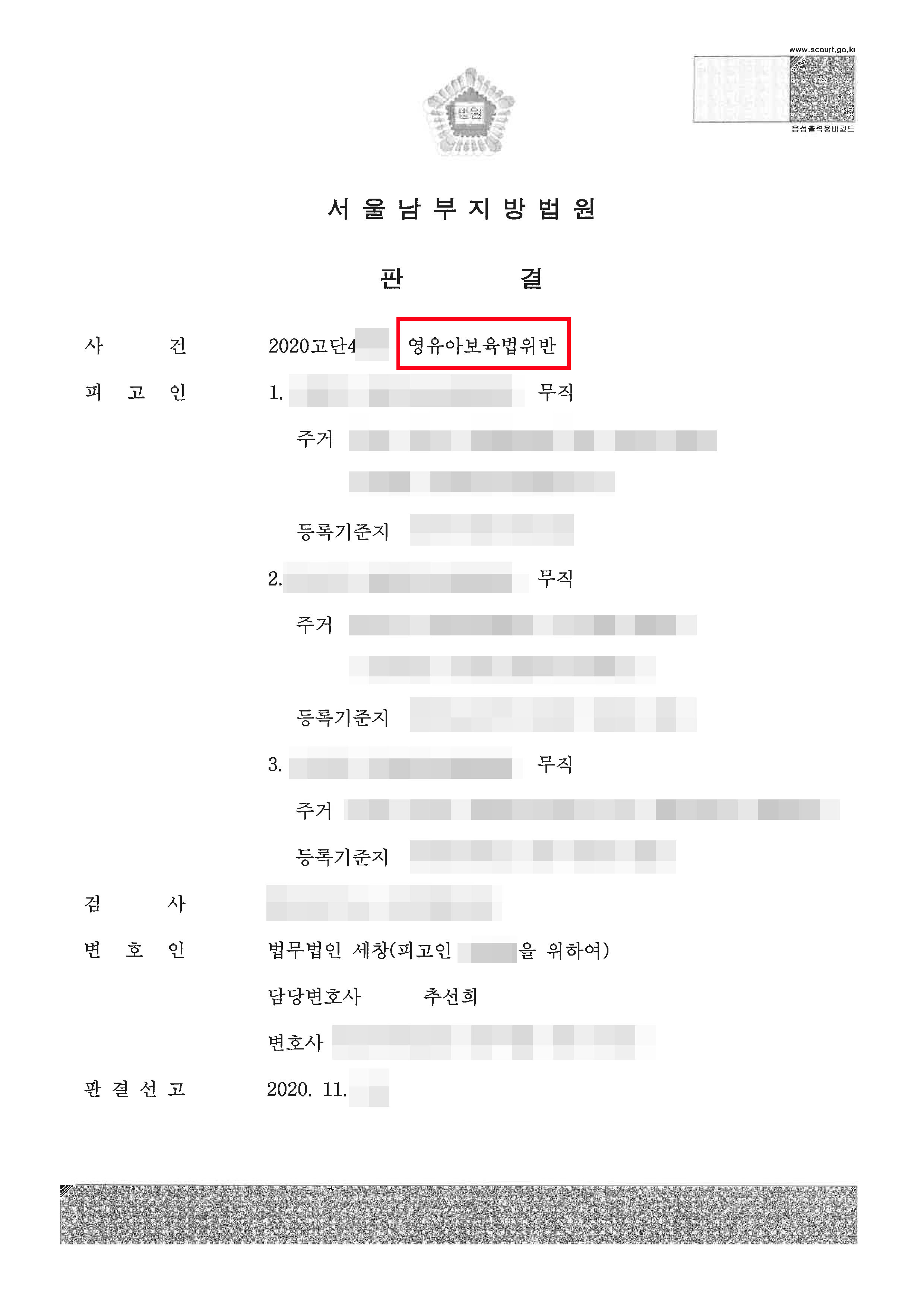 재판부에서는 변호인의 변론을 고려하여 의뢰인이 인정하고 있는 범행에 대하여 인정하면서도, 그 벌금의 액수를 영유아보육법상 자격에 영향을 끼치지 않는 200만 원으로 선고하여 추가적인 자격상실의 불이익을 받는 것을 피할 수 있도록 하였습니다. 의뢰인은 이번 사건으로 자신의 꿈을 잃을 뻔하다가, 기회를 상실하지 않게 된 점에 대하여 변호인에게 감사를 표하였고, 변호인도 보람을 느꼈던 사건입니다.