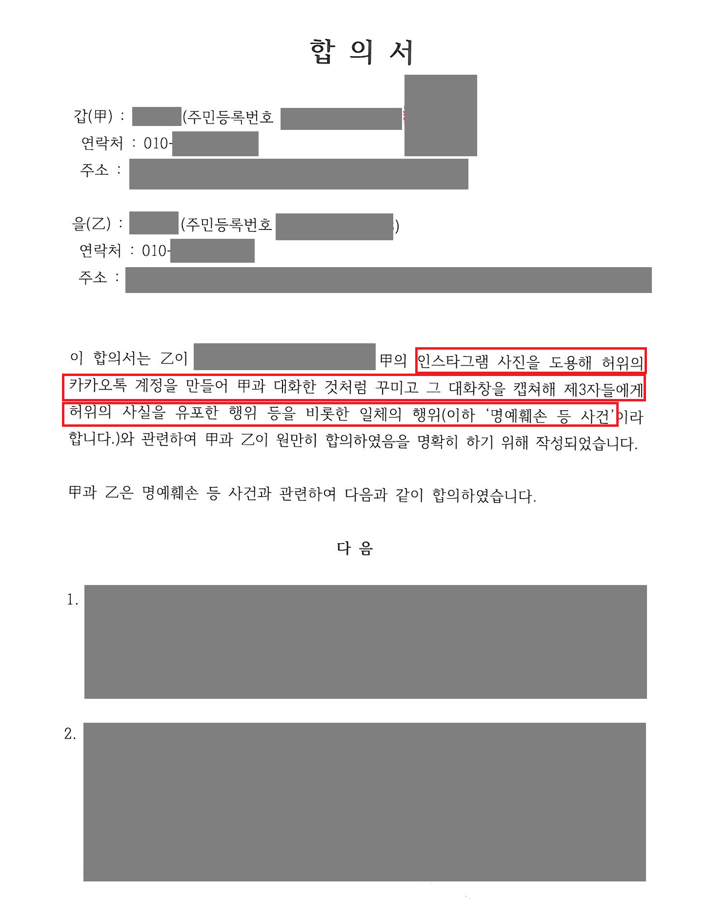 저는 가해자의 SNS를 면밀히 분석하여 단순히 도의적으로 비난을 할 수 있는 정도를 넘어서서 의뢰인에 대한 명예훼손 등 불법이라고 볼 수 있는 표현들·게시물들을 분류하였고, 이를 바탕으로 가해자에게 행위 중단을 요구하면서 법적인 조치를 예고하는 내용증명을 발송하였습니다. 가해자는 즉시 잘못을 인정하고 사과하면서, 법적 분쟁을 희망하지 않으며 원만히 합의하기를 원한다는 뜻을 저에게 밝혀왔습니다.