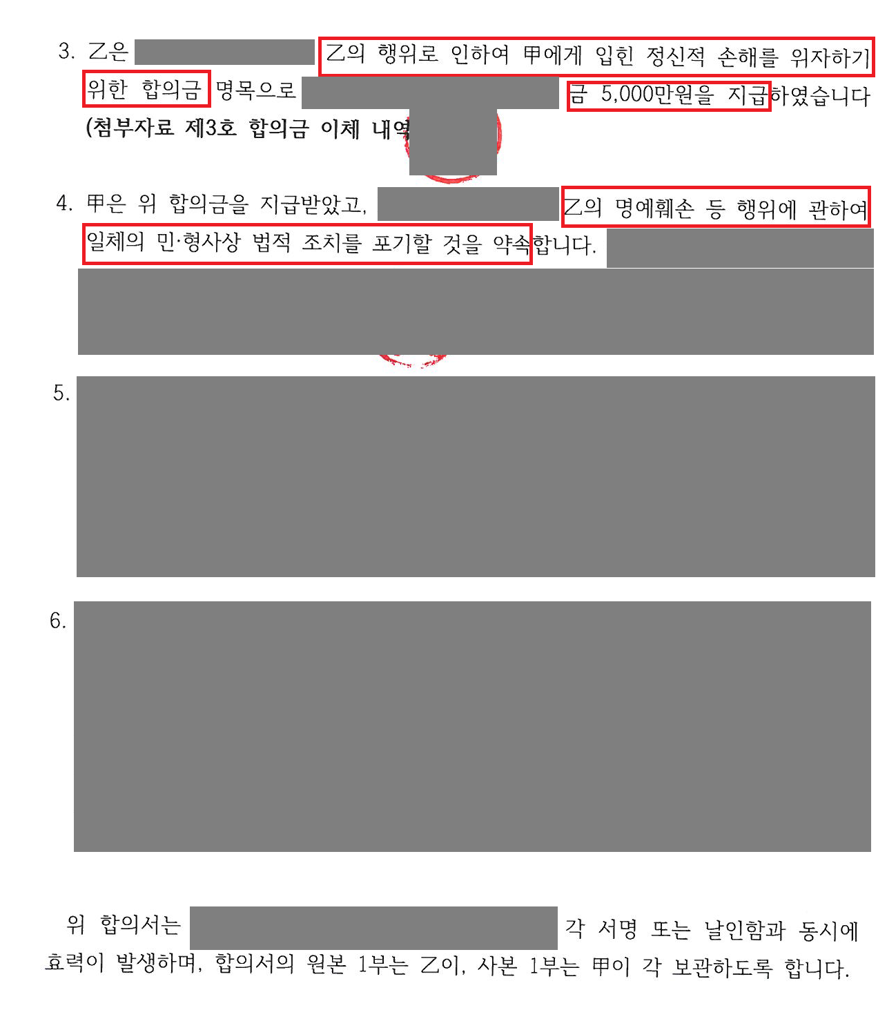 의뢰인은 가해자를 상대로 법적인 조치를 취하지 않는 조건으로 합의금 5,000만원을 수령하고 합의하였습니다. 저는 가해자와 의뢰인의 뜻을 존중하여 고소전 합의를 통해 문제를 해결하였으며, 덕분에 의뢰인은 취업 준비로 바쁜 시기에 수사기관을 들락거리면서 시간을 뺏기고 신경을 써야 하는 상황을 피하면서도 충분한 경제적 보상을 받고 추가적인 명예훼손 행위를 중단시킬 수 있었습니다.