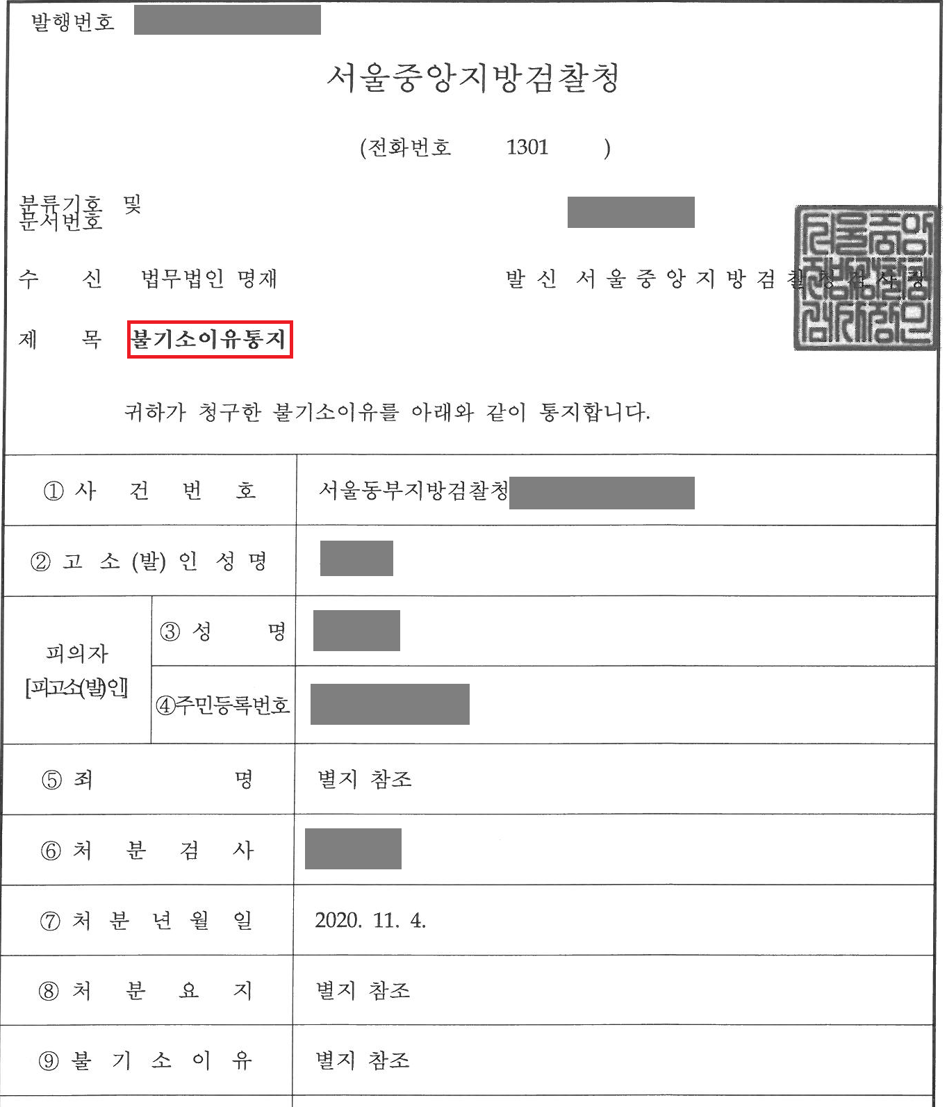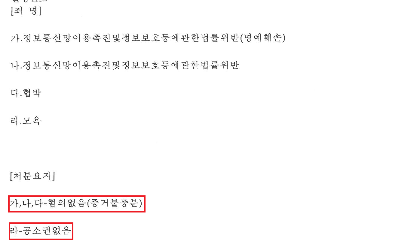 검찰은 고소된 내용 중 정보통신망법 위반(명예훼손), 정보통신망법 위반(비밀침해), 협박 혐의에 대해서는 무혐의처분을 하였고, 모욕 혐의에 대해서는 불기소(공소권 없음) 처분을 하였습니다.