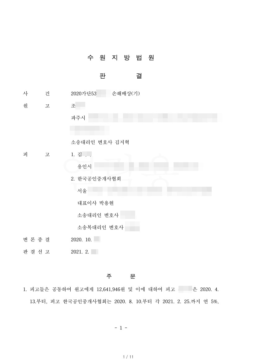 결국 법원은 공인중개사의 업무상 과실을 인정하였고, 이에 대하여 우리가 청구한 금액의 상당 부분을 배상하라는 원고 일부 승소 판결을 내렸습니다. 피고는 항소하지 않아 판결은 확정되었고, 의뢰인은 보험회사인 공인중개사협회로부터 손해배상을 지급받았습니다. 법원이 인정하는 손해배상 비율은 사안마다 차이가 있으니, 이와 유사한 피해를 입으신 분은 상담을 통하여 손해배상청구를 적극적으로 고려하시기 바랍니다.