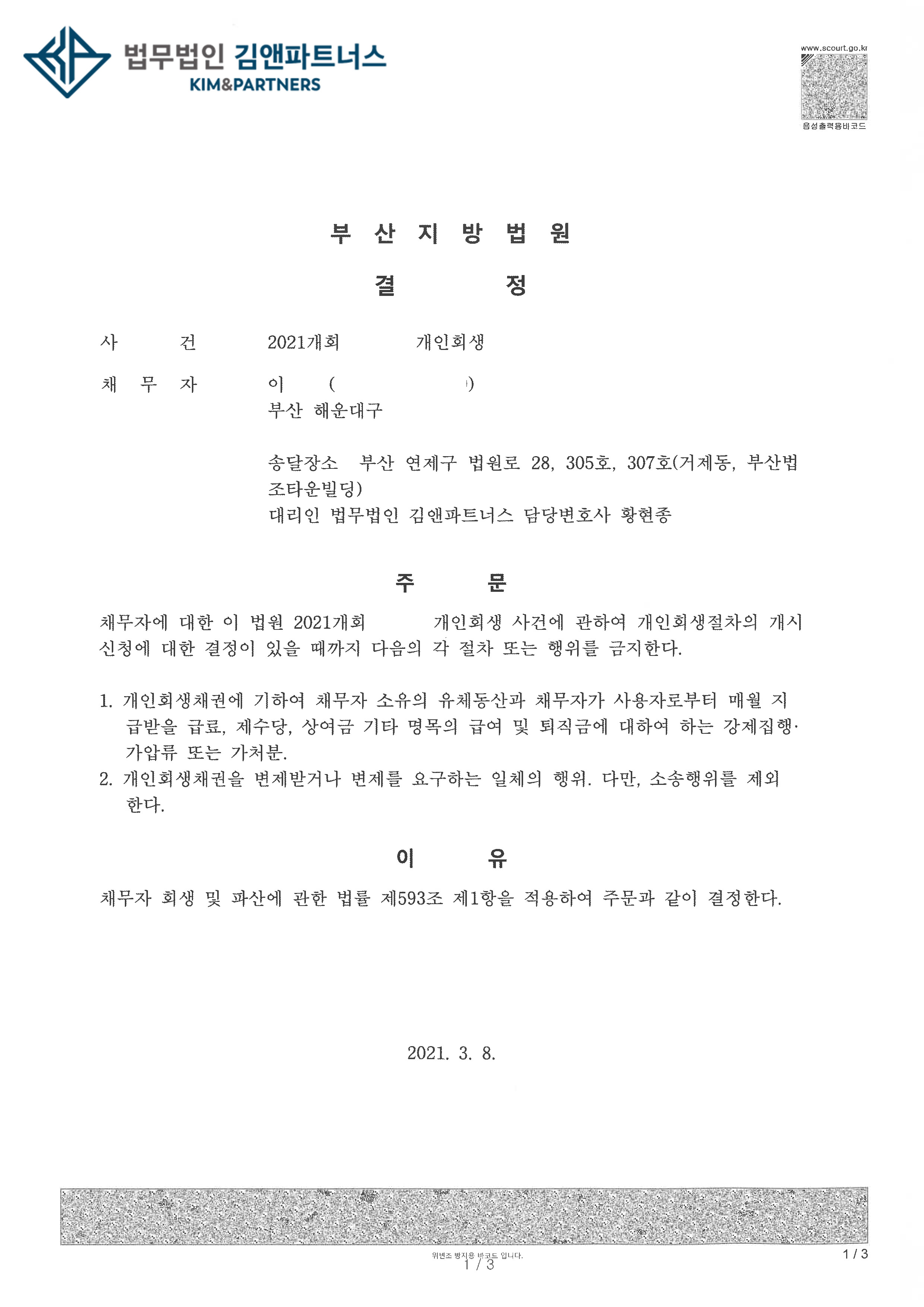 의뢰인은 금지명령을 받고 급여압류 등의 위험에서 벗어나 개인회생절차를 무사히 진행할 수 있을 것입니다.